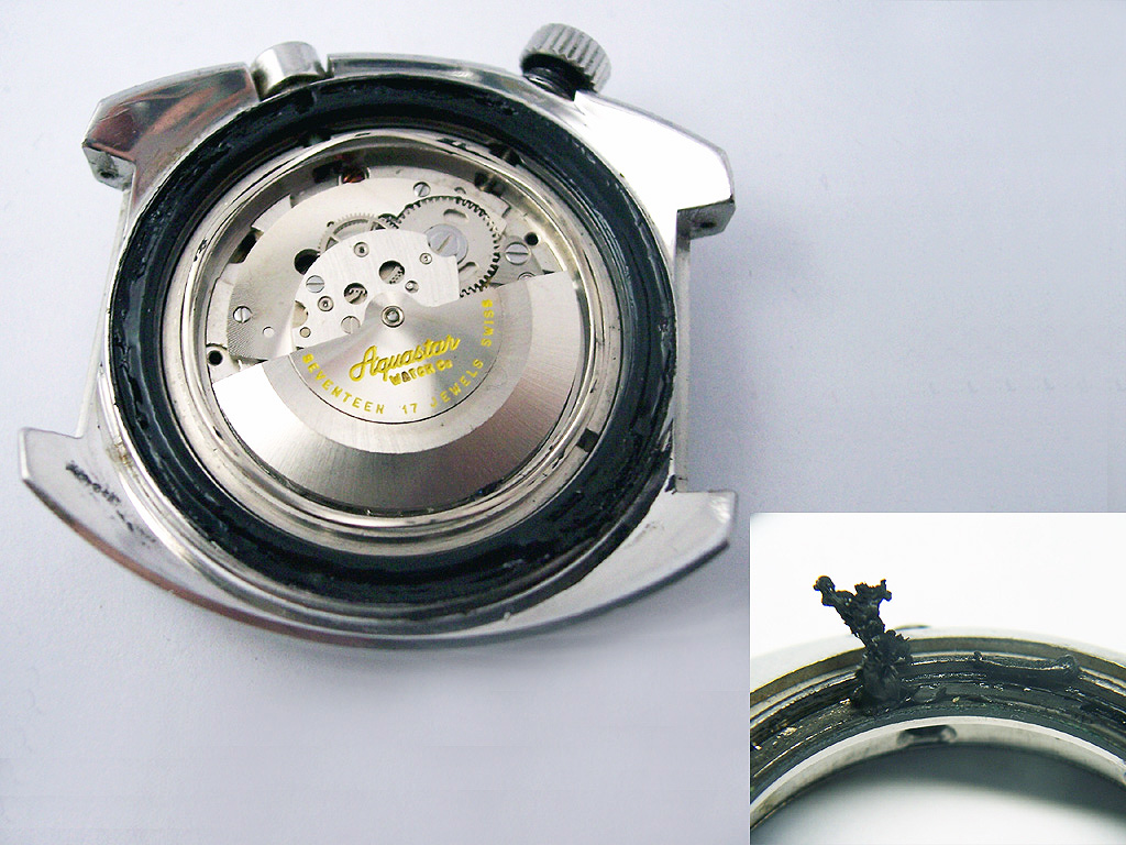 Removing the caseback showed a nice clean movement, but the gasket had broken down into black slime. This seems to happen after many years of being left untouched. This stuff is difficult to remove and unfortunately the rest of the gaskets were all exactly the same (see crystal gasket inset).