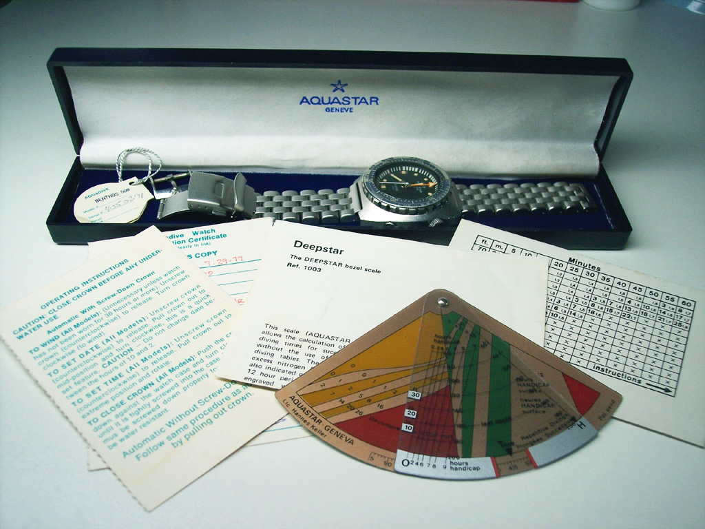 Also included in the sale was the original box and all the paperwork, including hang-tag, full instructions for the bezel, and a funky chart with a sliding scale for something to do with repetitive diving – to be honest I haven’t worked it all out yet! The only thing missing is the original isofrane strap (which wore out).