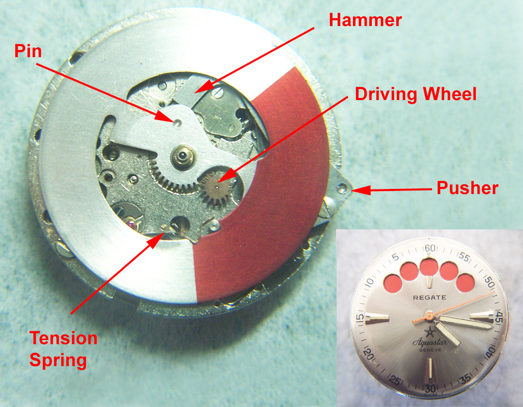 The picture above shows the timer in “stopped” condition, in this state the disc is locked in position by the tension spring. When the pusher is pressed, the hammer moves under the disc contacting the pin on the underside of the disc pushing it around anti-clockwise 90 degrees until the red section is at the top and the 5 holes in the dial show red (inset).