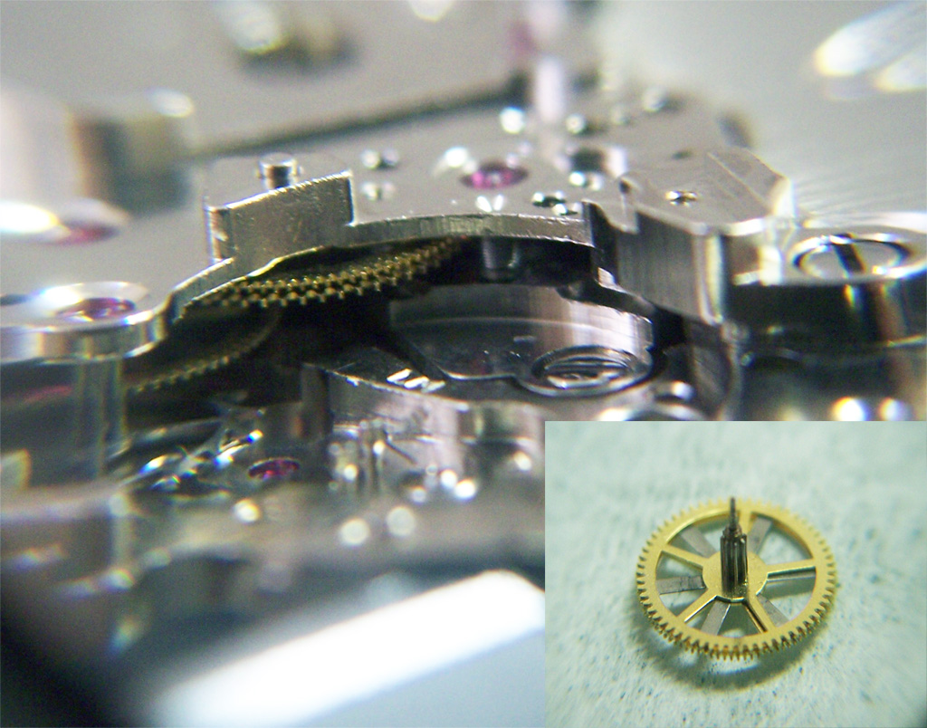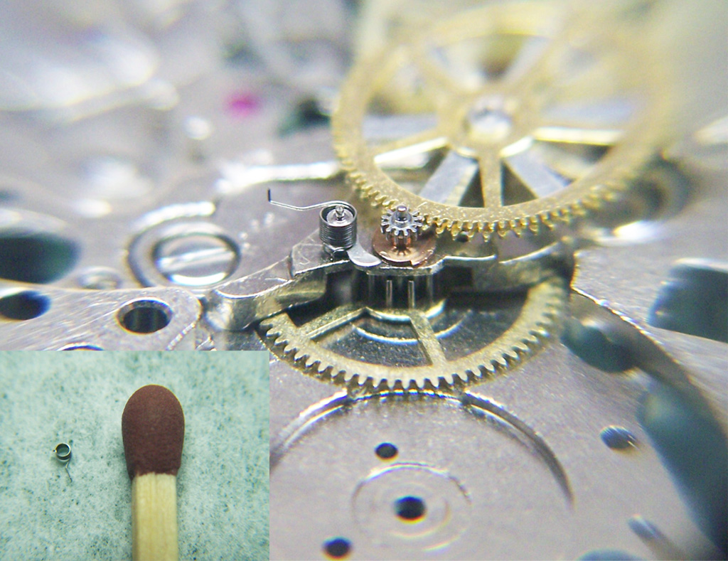This calibre has one more technical trick up its sleeve. When the timer is engaged it is essential that the second hand is returned precisely to zero to start the countdown, regardless of its position. This is made possible by the addition of a cam to the centre second axle, and beside it you can see there is a spring loaded lever. When the wheel train bridge is in place, this lever is pressed against the cam and stops the second hand in the zero position when the notch on the cam hits the lever. To give an idea of scale here, inset is a picture of the lever spring next to the head of a standard match.