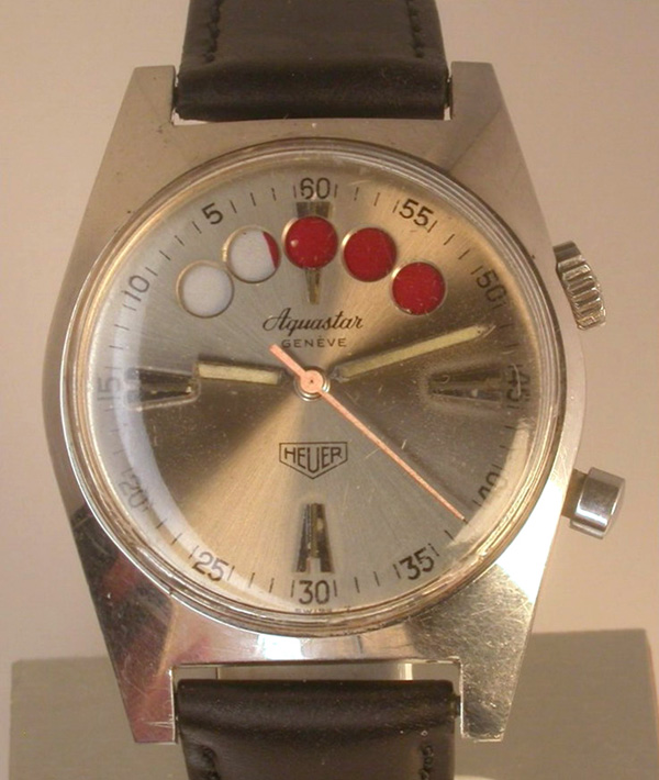 During the 1960’s Aquastar watches were distributed by Heuer, and in 1965 they went into partnership to develop sailing timers, the Heuer name being added to the dial of subsequent Regates…