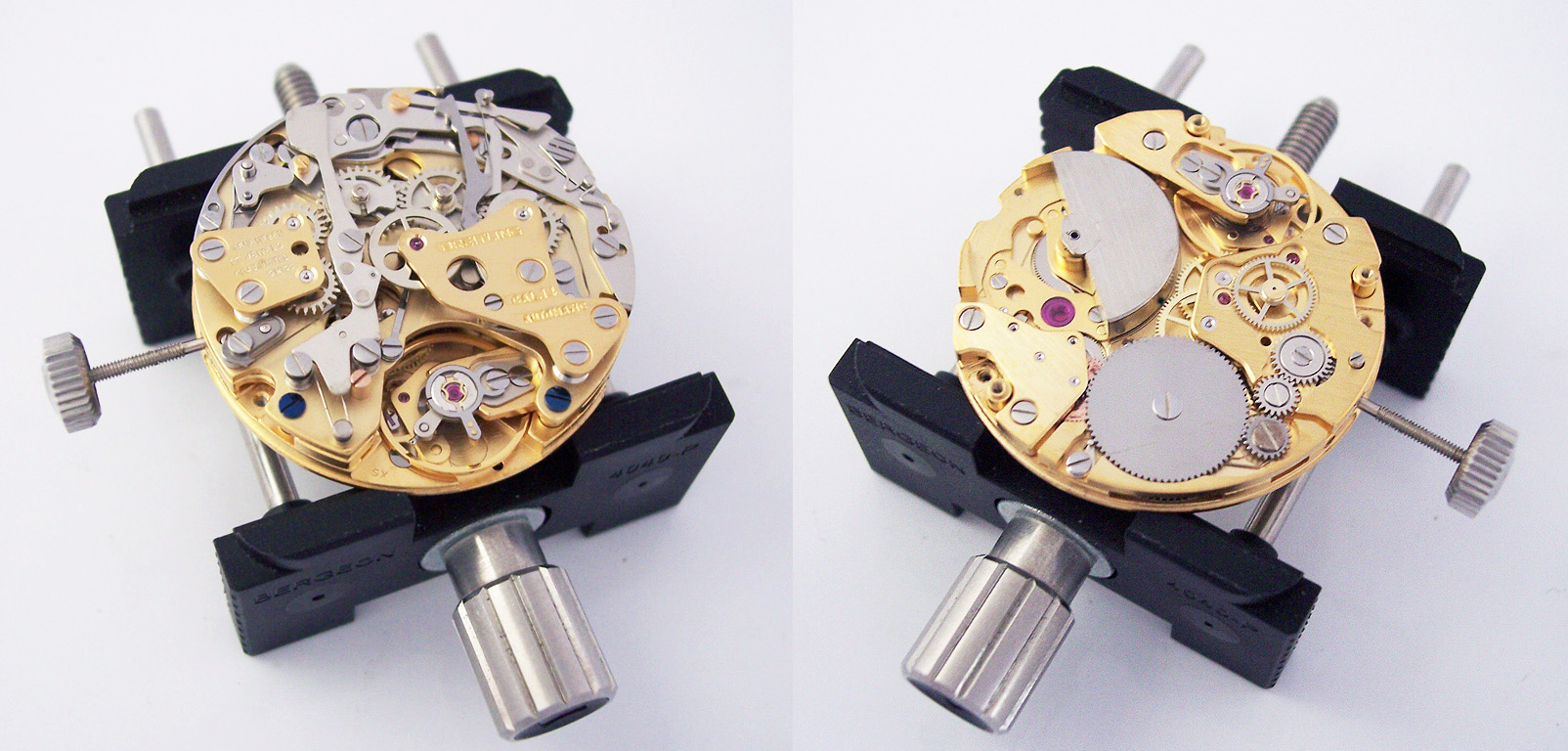 Regular readers will undoubtedly have seen this before but the automatic winding mechanism on this calibre is ‘hidden’ in the centre of the calibre under the chronograph module. Here is a picture of the movement with and without the module in place, as you can see it’s in great shape after a full service.