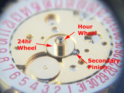 In watches with a both an hour hand and a 24hr hand, like this Seiko Navigator Timer, the 24hr wheel has less height than the hour wheel to allow both hands to be mounted. In the Cosmonaute, as there is no regular hour hand, the 24hr wheel is the same height as the hour wheel – the hour wheel only drives the calendar in this watch.
