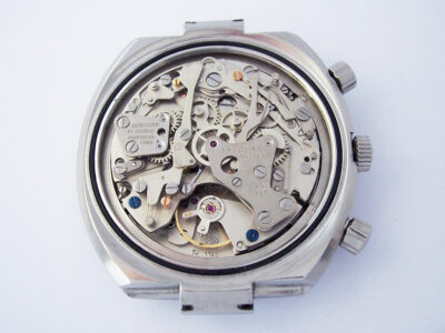 You could be forgiven for thinking that it was the automatic Cal. 11/12 calibre, as at first glance the two calibres are almost identical. With the chronograph module removed however, you’ll see that the base movement is manually wound.