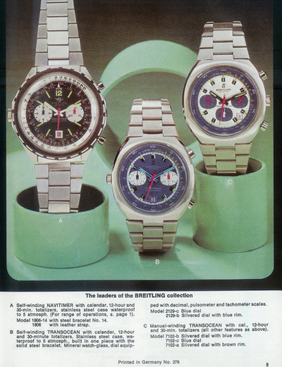 Available in a several colour variations, the models were similar but are easy to tell apart as the crowns are on different sides – on the left for the Chrono-Matic and on the right for the manual. Here is a picture of both models together in a catalogue from that period.
