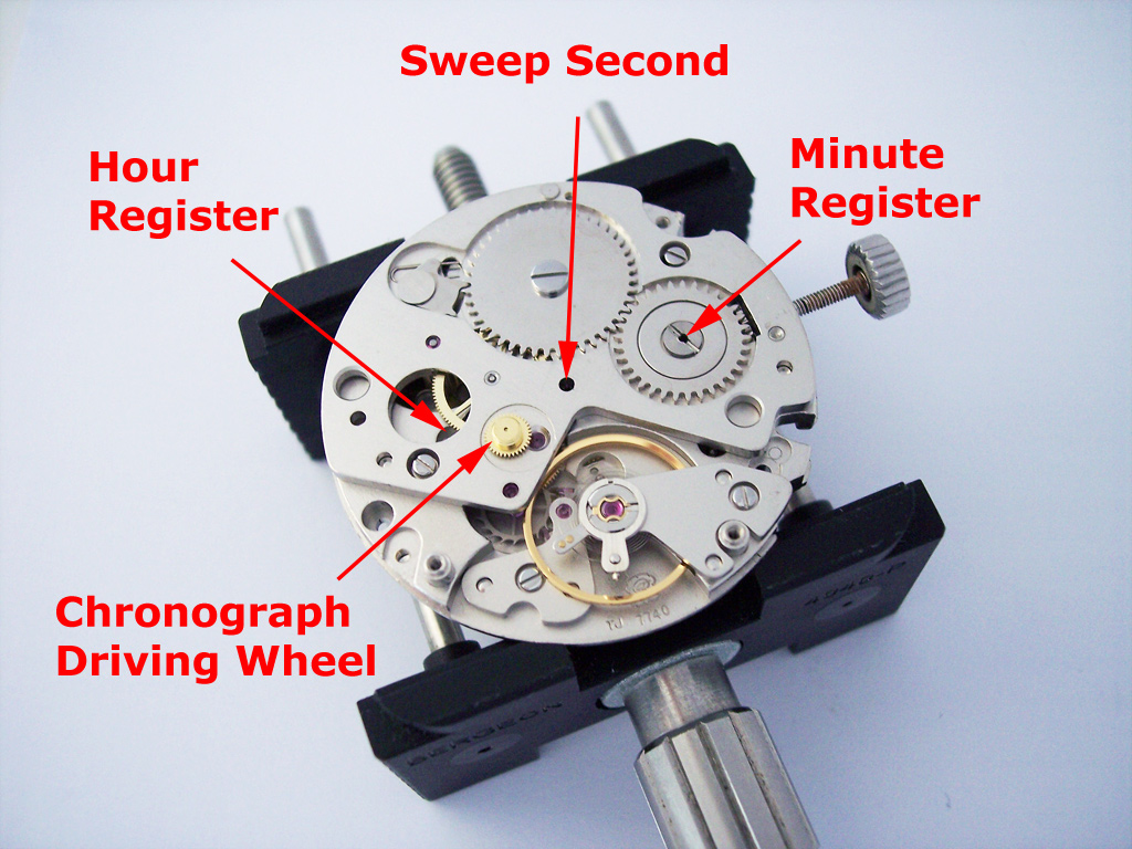 The gold coloured driving wheel provides the power for the chronograph module and the calibre has three holes to allow the sweep second, minute and hour register axles to pass through it.