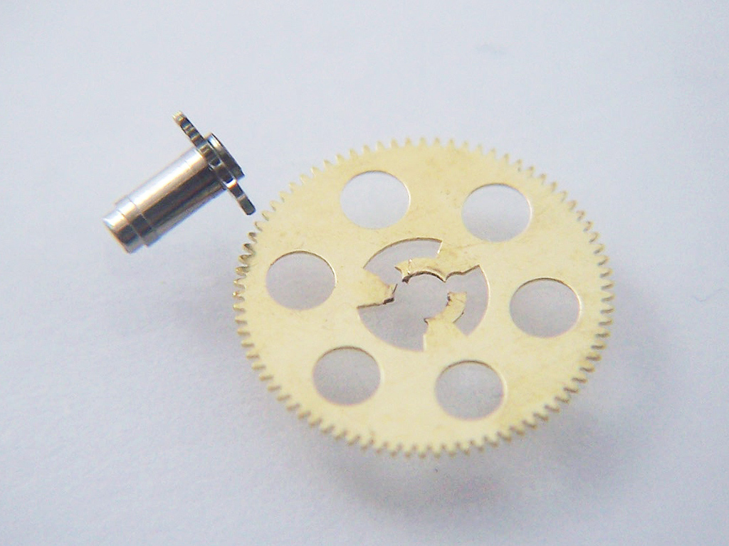 However, on disassembling the movement I was relieved to find that wasn’t the case and the problem was actually the cannon pinion driving wheel which was damaged. It was missing a centre section and so could no longer provide enough friction to drive the calendar mechanism forward.
