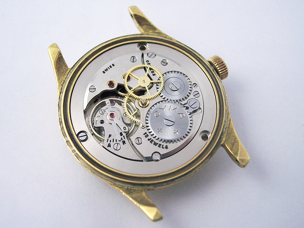 The watch in this post was made during the 1950’s and is fitted with a Cyma cal. 416 Ka., a straight forward time only calibre with a leisurely beat rate of 18,000 bph (in modern watches that has now increased to 28,800 bph or 6 bps for increased accuracy). Though not quite as finely finished as the Longines cal. 30L I wrote about recently, the Cyma still has chatons for the train wheels and an overall quality feel.