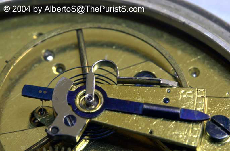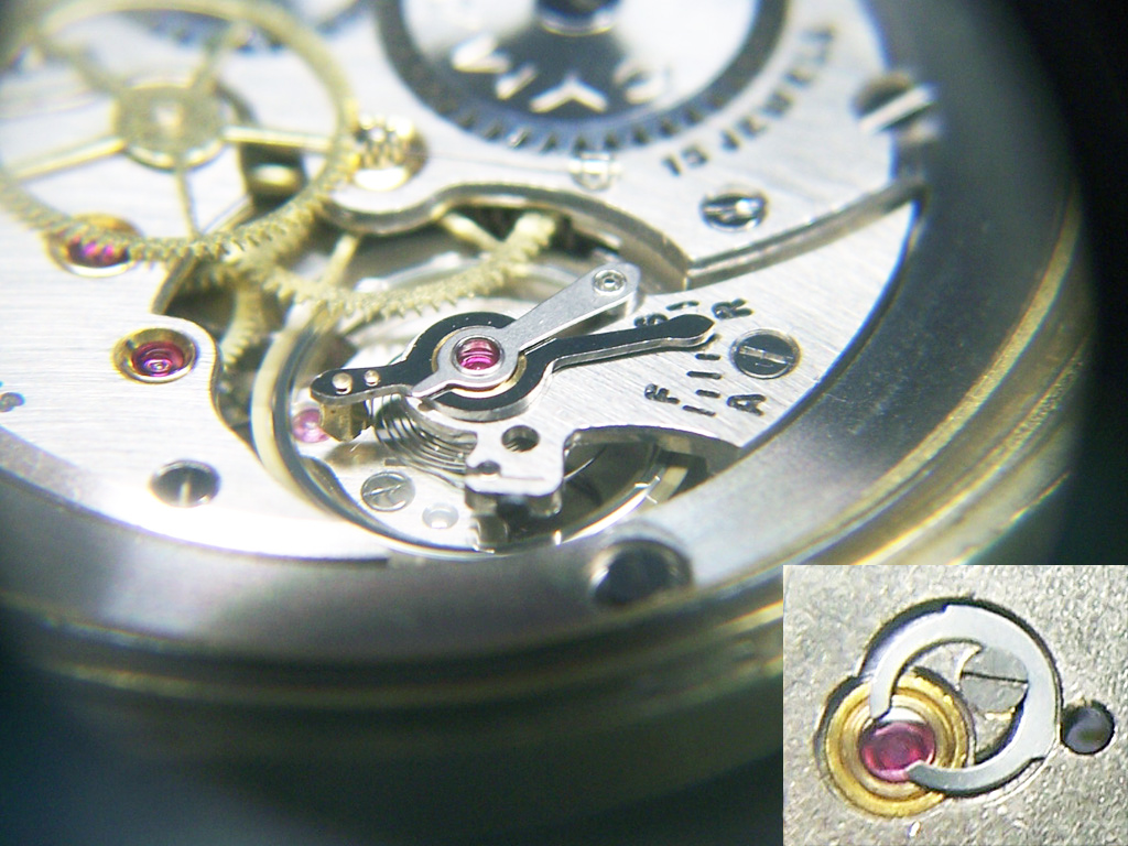 Protection is provided by a thin steel arm mounted on top of the balance cock which houses the cap jewel for the balance staff. In the event of a shock the arm flexes to absorb the force, cushioning the pivots on the balance staff. Inset is the more simple spring fitted to protect the balance staff pivot on the dial side of the movement.