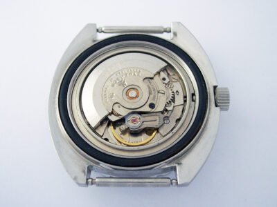 … and inside is an ETA cal. 2783, a reliable Swiss ‘work horse’ calibre found in many watches from this period. Running at 21,600 bph, with a handy quickset for the date via the crown, it was available in 17, 21 and 25 jewel variants, the one here is 17 jewel. You can see too that the rotor is again signed with the Synchron, rather than Doxa, name and logo.