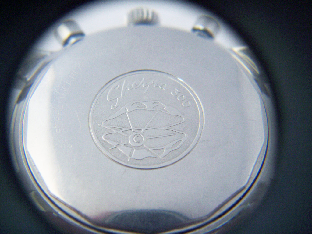 Turning the watch over the caseback has some nice decoration in the centre, “Sherpa 300” in script (300 being the water resistance in feet) and a picture of an oyster with a pearl, denoting the ‘Seapearl’ for which Enicar are also well known.