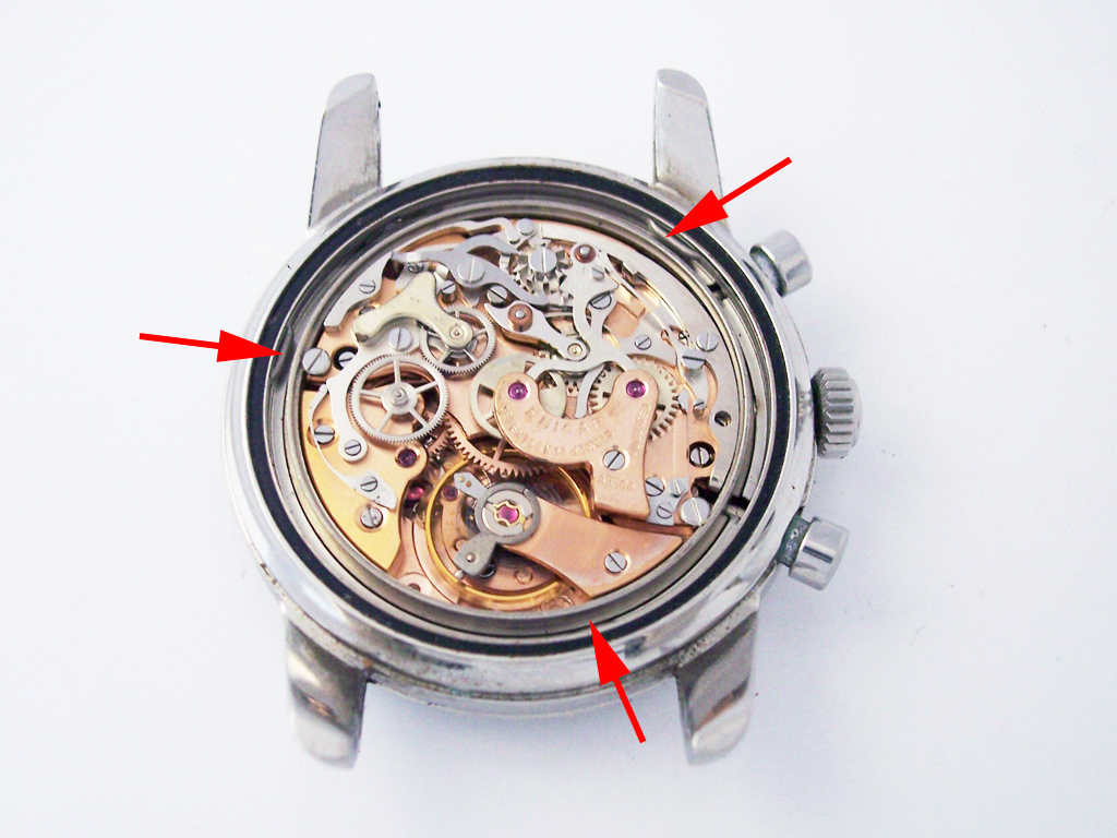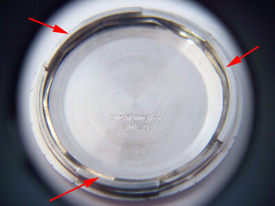 When the caseback is placed inside the case in the correct orientation and turned through 75 degrees, the lips on the caseback hook under the wire loops securing the caseback in place. Simple but effective – though it can still catch out anyone who is unfamiliar with this type of case construction.