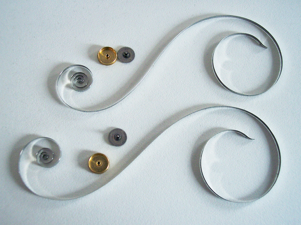 Here is a picture of the two barrels and springs when disassembled. Interestingly, the design of the barrel unifies the barrel arbor and ratchet wheel into one part so both parts reside underneath the winding bridge resulting in a thinner calibre (3.1mm) and an uncluttered aesthetic.