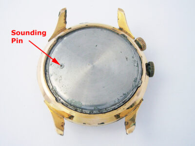 … and under the screwdown outer caseback is a sounding plate with a pin mounted on the inside which is struck by the alarm hammer, causing the plate to resonate when the alarm is ringing.