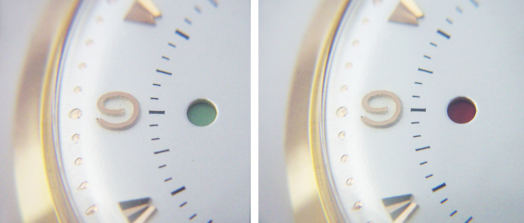 The Venus cal. 230 is an unusual alarm calibre as it only has a single mainspring barrel powering both the alarm and the going train. The calibre also has an uncommon dial aperture showing the alarm state; green for on, red for off.