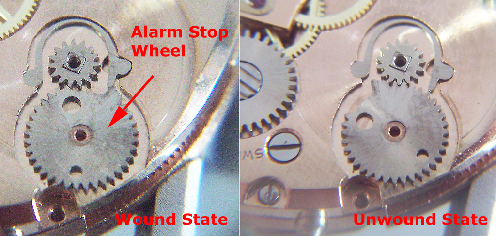 When winding the watch the first four complete revolutions of the barrel arbor set up the power source for the alarm. Under the ratchet wheel is the alarm stop wheel which controls the release of power when the alarm is triggered. When fully wound the missing teeth in the stop wheel allow the arbor/mainspring to be wound further to power the going train. The alarm stop wheel also acts as the click in a regular watch preventing the mainspring from unwinding.