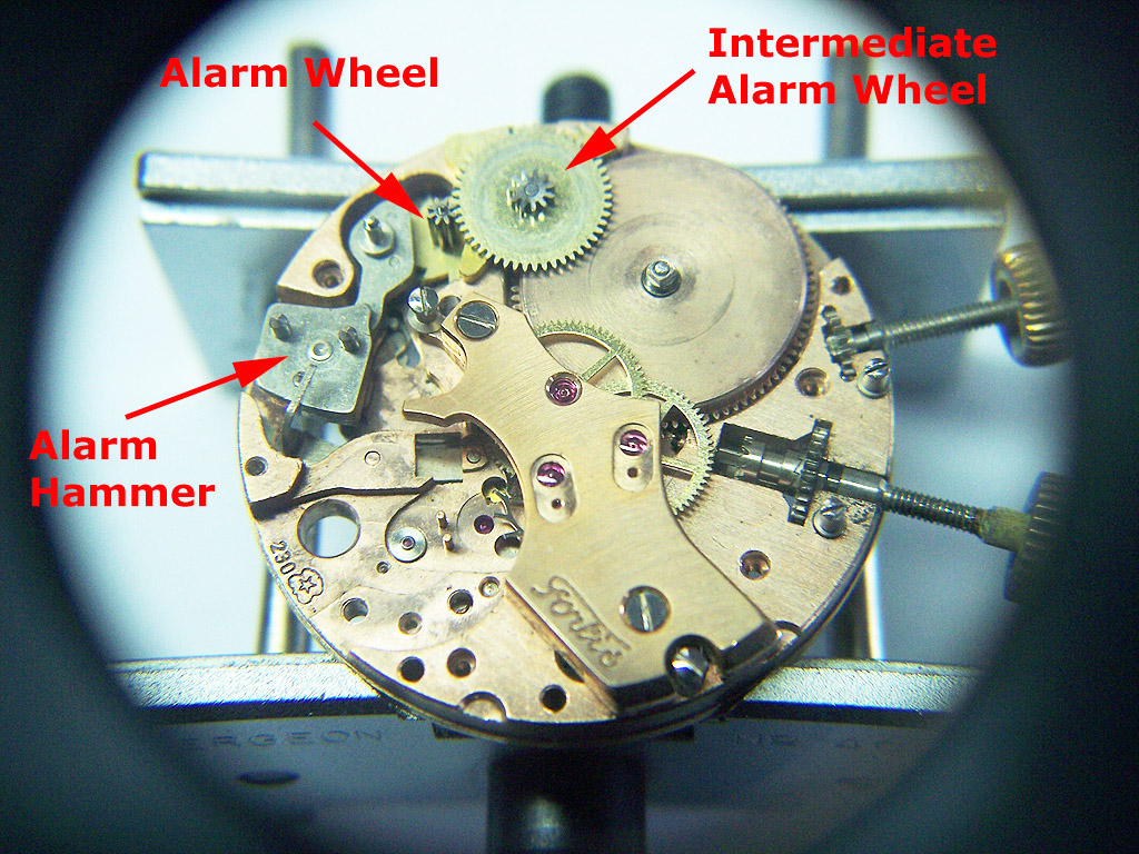 When the alarm is triggered the ratchet wheel rotates counter-clockwise, transferring power through the intermediate and alarm wheels to the alarm hammer which rocks back and forth, the two pins on top striking the pin in the sounding plate on the case.