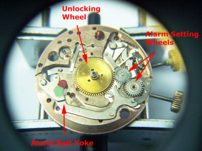 When the raised sections and the holes in the unlocking wheel align (in other words, the alarm time is reached) the hour wheel rises along with the disconnecting lever underneath, freeing the alarm hammer on the other side of the movement, releasing power from the mainspring and sounding the alarm as detailed above.