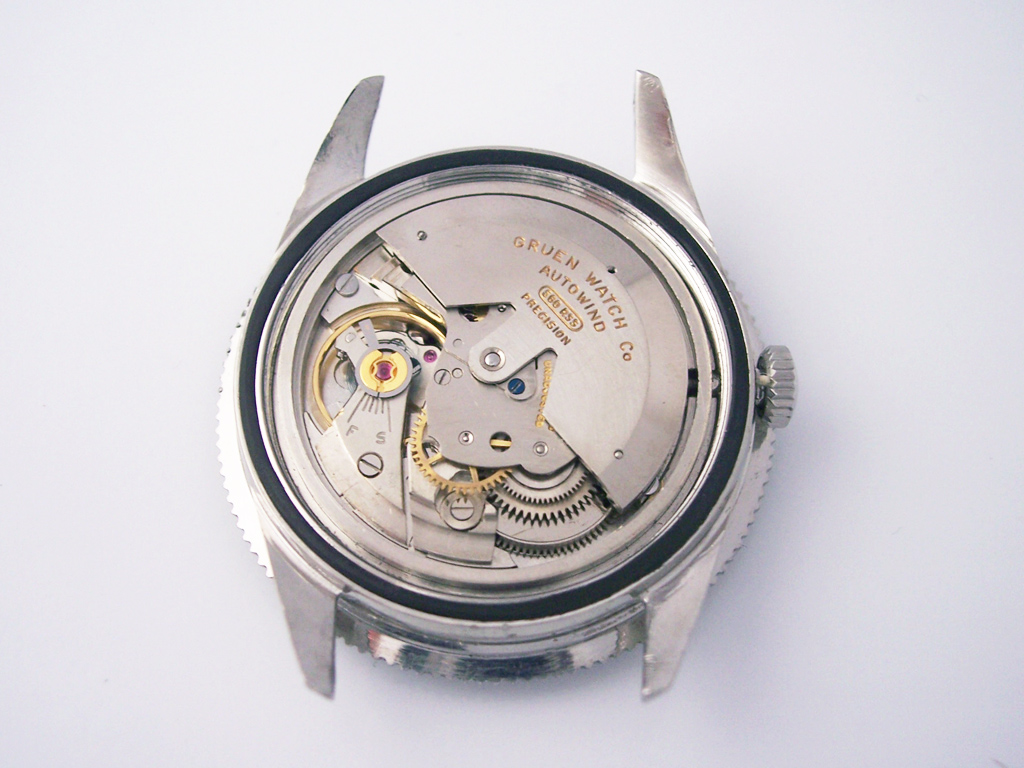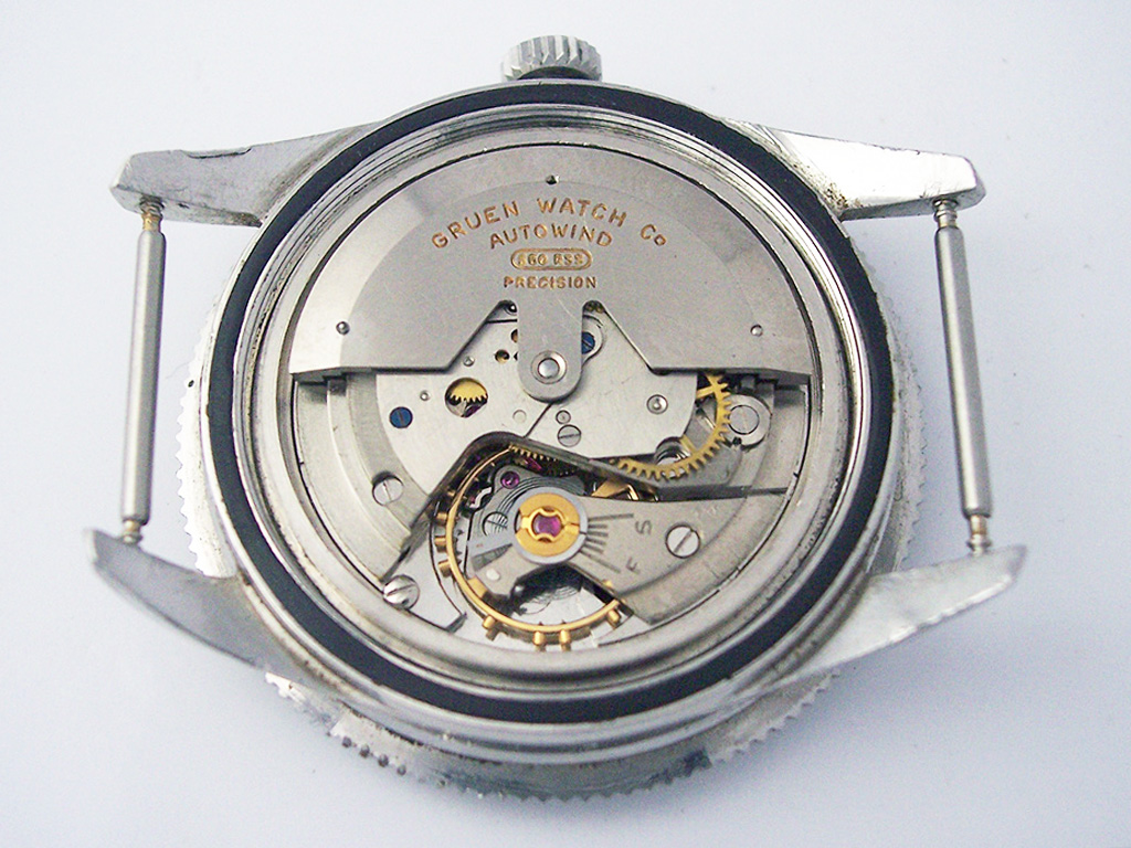 The calibre inside the watch in this post is a Gruen cal. 560 RSS. Although Gruen did produce their own calibres, by the time this watch was produced all the manufacturing facilities had been sold off and Gruen were sourcing calibres from other manufacturers and re-branding them as their own. The base caliber of the 560 RSS is a 17 jewel Bidlingmaier ebauche, with an added automatic winding mechanism (a 23 jewel version was also available).