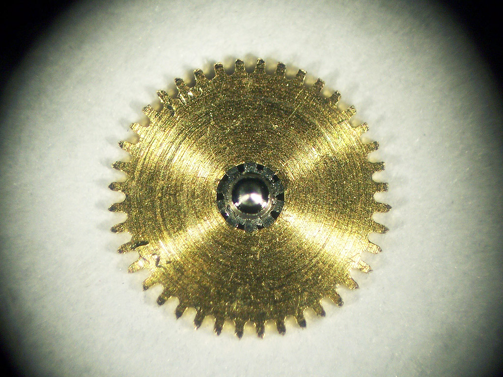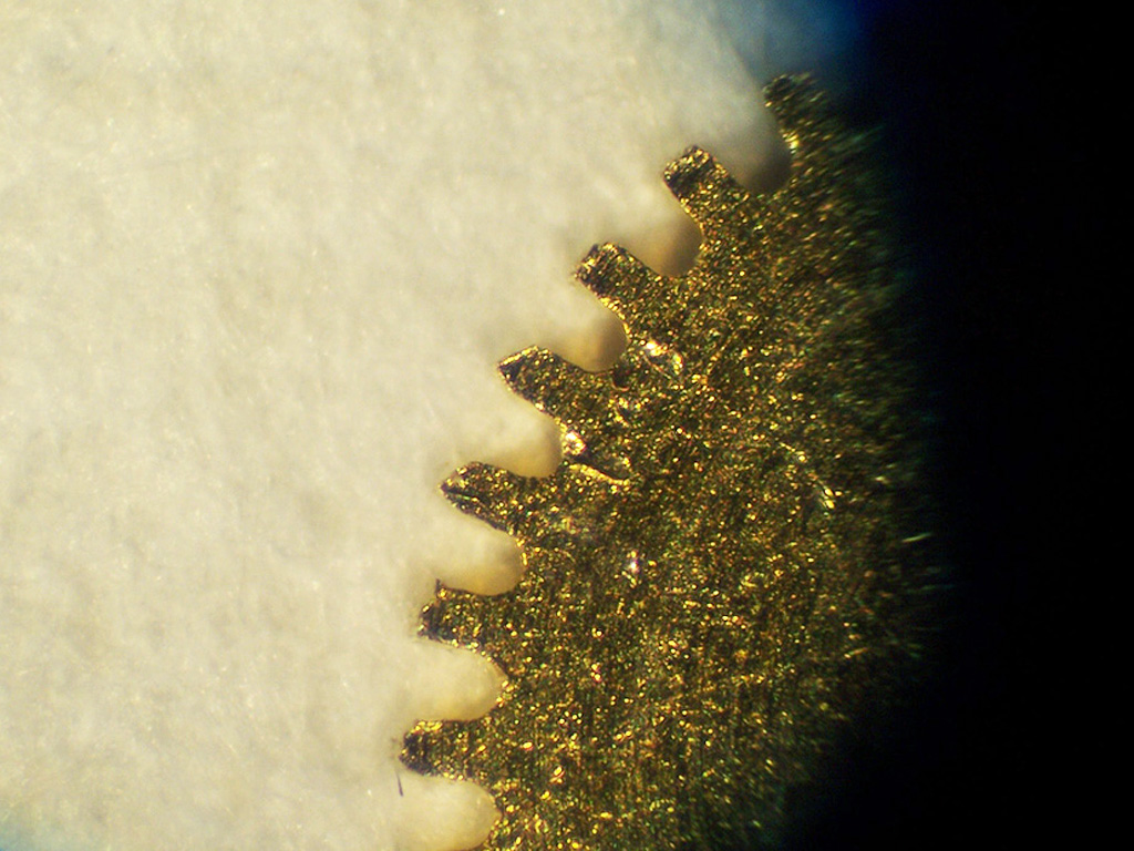 It’s not uncommon to see some wear in an automatic winding mechanism, especially after decades of daily use, but in this case the wear was not obvious without magnification. The picture below shows one of the transfer wheels at 30 times magnification and as you can see, the tops of the teeth in the top right quadrant have worn away.