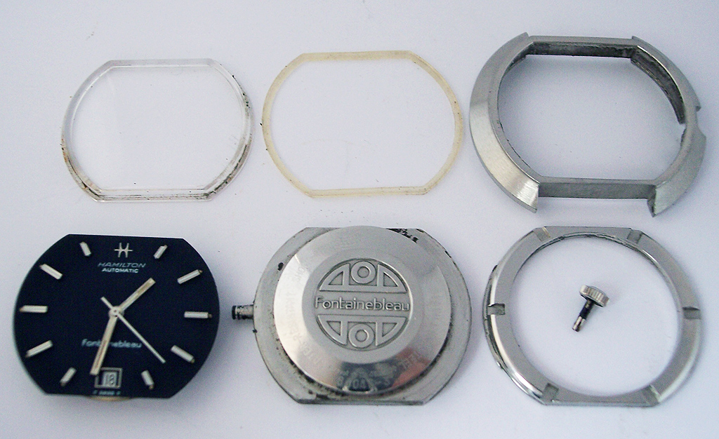 Here is a picture of the disassembled case components, all in need of a good cleaning – I was pleased to find both the crystal and gasket in good condition as sourcing replacements would most likely have proven difficult.