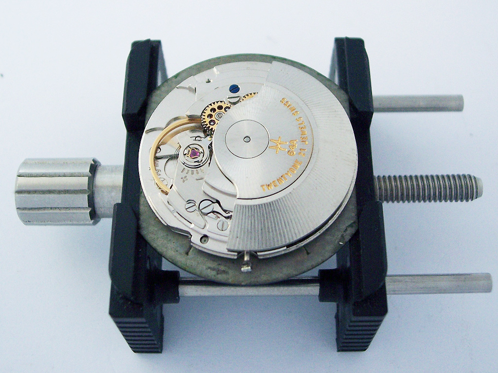 To remove the movement from the case, the caseback is rotated 90 degrees, which then releases the compression from the case top around the crystal and both parts and the crystal gasket can be removed. The split-stem can then be separated and the watch removed from the case. With two straight edges, it was possible to clamp this case in my case opener and so it proved much easier to open that the Odyssee 2001, which was a relief!