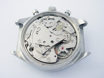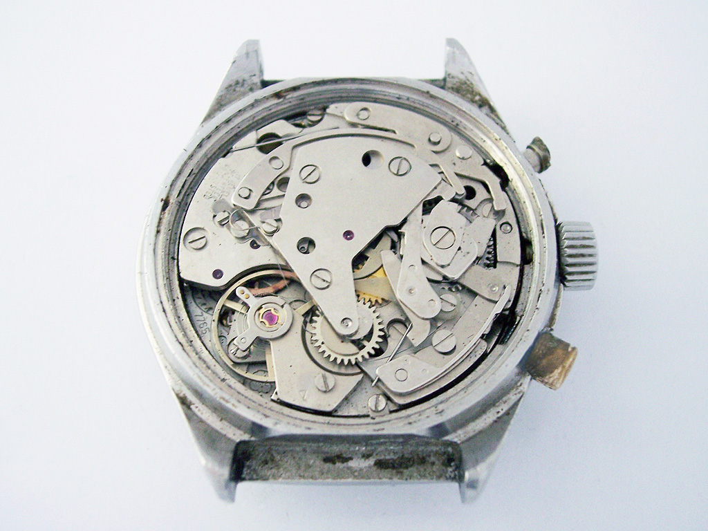 As is evident from the first picture, the watch in this post had been through the wars. It was a weak runner and the chronograph didn’t work at all – mainly because the pushers were completely trashed! Thankfully, once inside the watch the movement wasn’t in terrible shape.