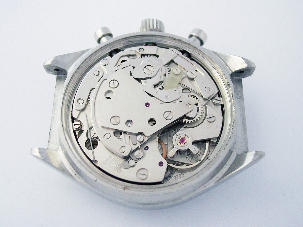 Once out of the case, another problem with the chronograph mechanism was immediately obvious, the operating lever had been broken off meaning the chronograph couldn’t be started or stopped, even with new pushers. Parts for the Valjoux 7765 are still available so sourcing a new part was no trouble this time and the rest of the movement service was straight forward.