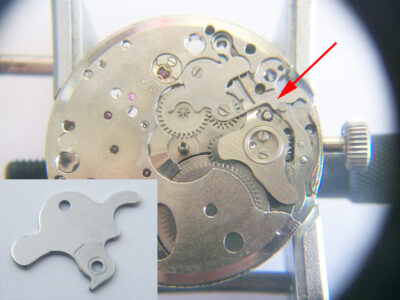 This had obviously been unsuccessful as the shaft was largely still in place and doing so had trashed the threads in the mainplate. To make matters worse, rather than repair the damage properly, as a workaround, the replacement click screw had been superglued into the hole. A nasty surprise for the next watchmaker… ie. me!