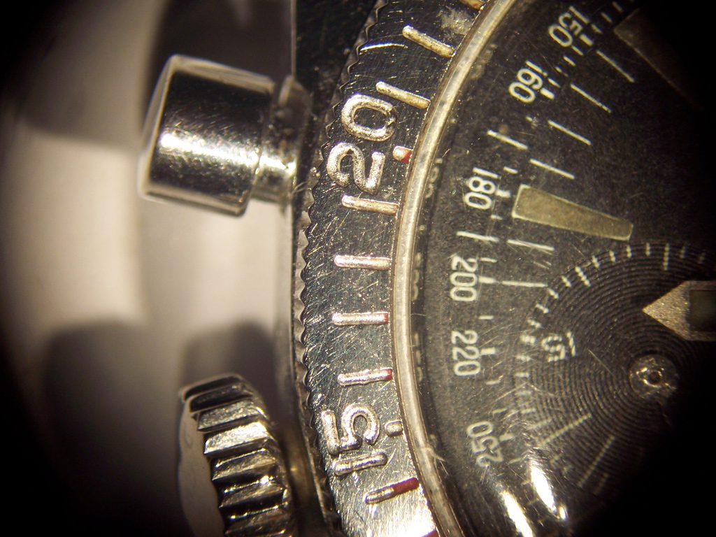 The last thing to do was to remove the old paint and refresh the bezel markings. There was some discussion with the owner regarding the choice of colour scheme. On close inspection of the remaining paint fragments it appeared that originally the numbers were black and the minute track was red all the way around, so we went with that.