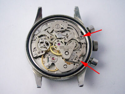The watch in this post arrived in running condition, but the chronograph wasn’t working at all. On opening the watch (and revealing a Croton branded Valjoux cal. 7733), the problem was immediately obvious, the screws for the operating and reset levers were both broken.