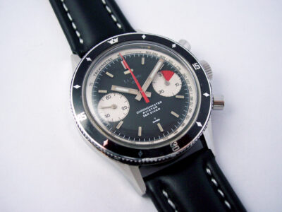 The watch is unmistakably a Nivada / Croton Chronomaster which has been re-branded (see here for an example). Looking at the dial print it is obvious that the model name and minute track were printed together, and a space was left for the brand – you can clearly see from the quality and clarity of the print that the “Le Marc 100” has been added later.