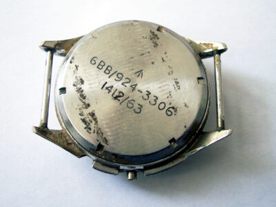 The caseback has the markings seen on all British military timepieces, the Broad Arrow symbol, a designation number, and a serial number.