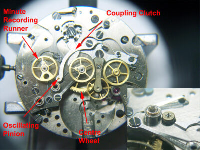 Much like the Valjoux cal. 92, the mechanism is controlled by an oscillating pinion (inset) which is constantly driven by the centre wheel. Only when the chronograph is engaged does the coupling clutch move across and the pinion is then in contact with the minute recording runner, moving it forward.