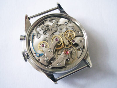 The majority of chronograph calibres have two pushers, one for starting and stopping the chronograph mechanism and one for resetting. This calibre is a mono-pusher chronograph in which a single pusher is used for all three functions. Subsequent presses of the pusher, start, stop and then reset the mechanism. Once the chronograph has been stopped, it is not possible to restart it from the same point as the next press of the pusher will reset it automatically to zero.