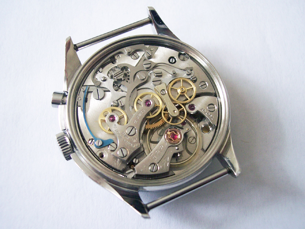 The operation of the minute register is also different in this calibre. In most calibres the chronograph runner has a finger mounted on it which advances the minute register by one marking as it passes. In the cal. 2220, the minute register sweeps around the dial in a constant motion rather than moving in discrete steps.
