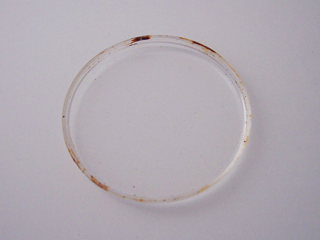 After several decades the acrylic becomes brittle and small cracks form in the lower edge of the crystal allowing dirt and rusty water to seep into the body of the crystal over time. Once this happens the only option to fit a new one.