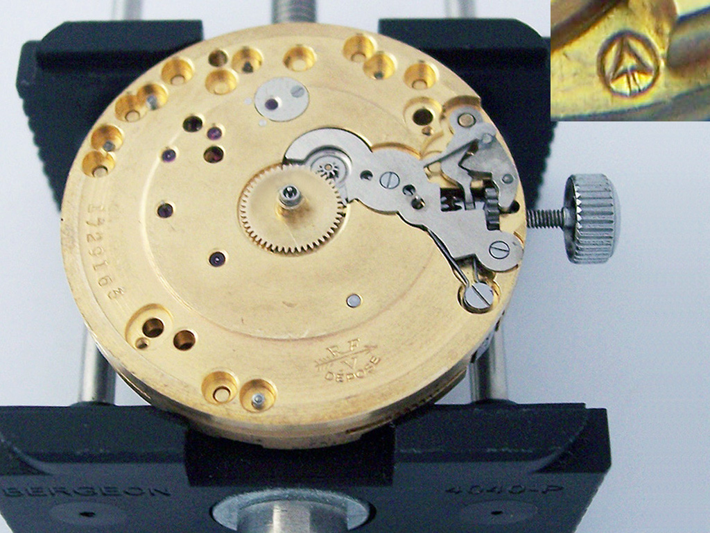 As well as the Minerva ‘arrow in a circle’ on the train side of the movement (pictured inset), the RFV trademark with the arrow is clearly visible here along with a serial number. Under the RFV trademark is the word ‘Depose’ which is short for Modèle Déposé, the Swiss/French for “Registered Design”.