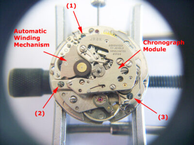 However, after a production run of just 23,000, time was called on the 1369 and 1376 due to reliability issues, and to be honest I’m not surprised, as it’s not what you’d call robust…. let’s have a closer look. This first picture shows the movement with the winding rotor removed and the automatic mechanism and chronograph module highlighted.