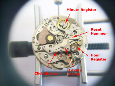 Under the top plate is the reset hammer for the minute and hour registers and the chronograph actuating lever/hour register brake. One thing to notice about this calibre is the number of click springs used – a click spring is a thin piece of wire used to spring load a lever, or hold a part in position.