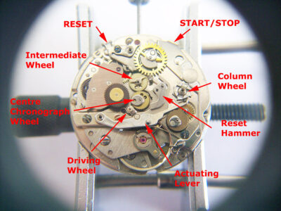 When the chronograph is stopped and the reset button is pressed, the reset hammer for the centre second moves across returning it to zero, along with the reset hammer for the minute and hour register two levels above.