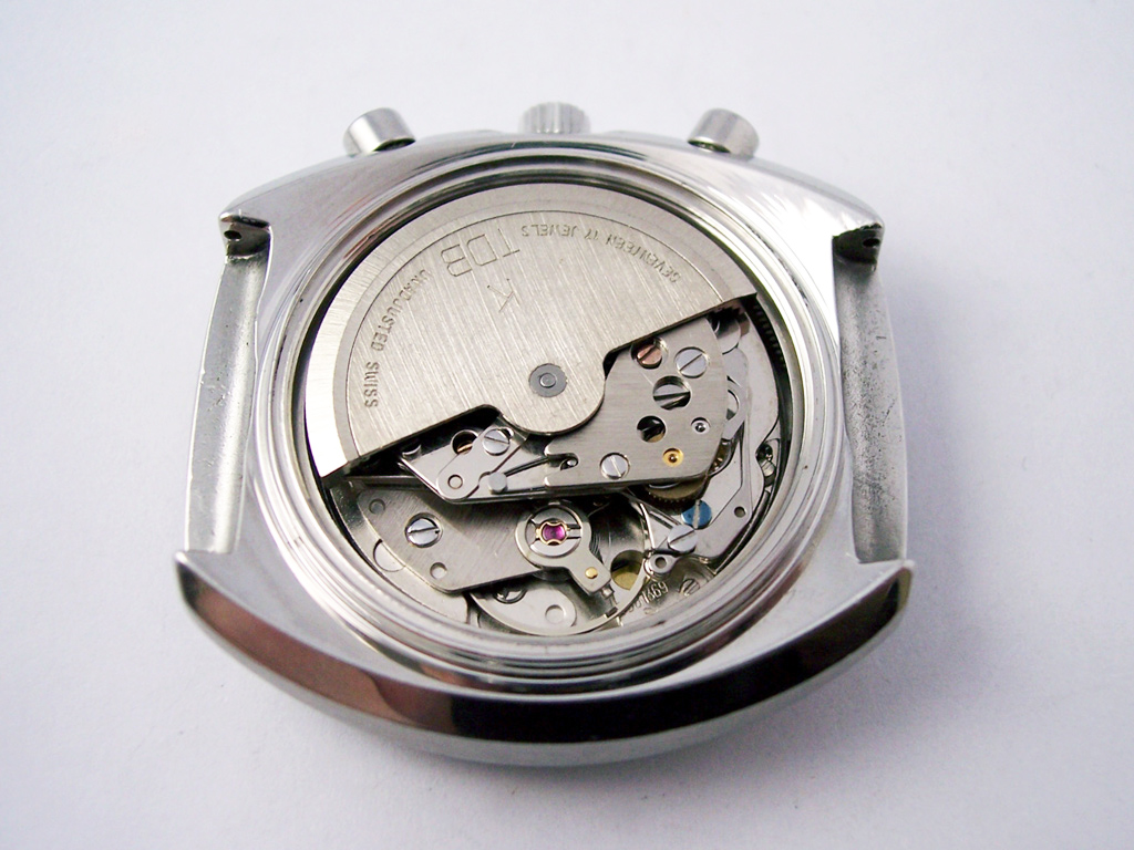 Just looking at the subdial layout it’s obvious that something out of the ordinary is lurking inside, and opening the caseback reveals a TDBK cal. 1369; a 17 jewel (modular) column wheel chronograph calibre which runs at 21,600bph.