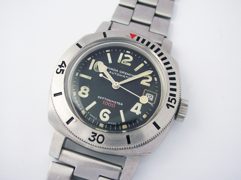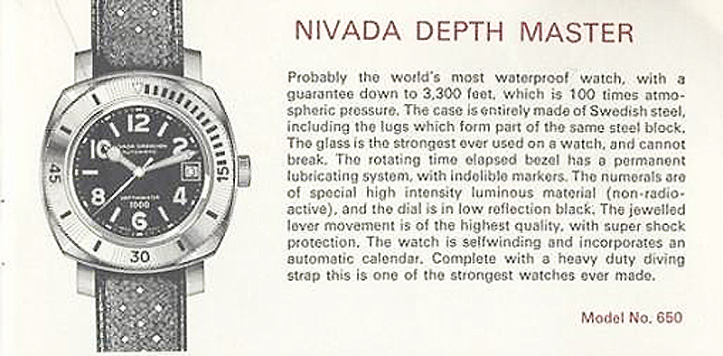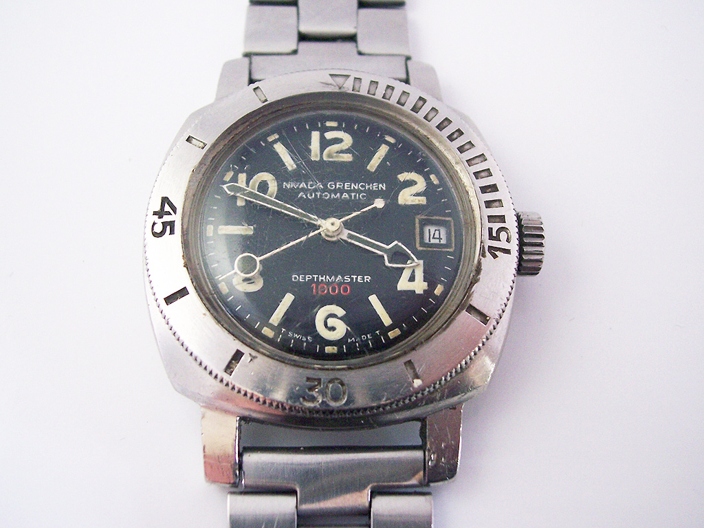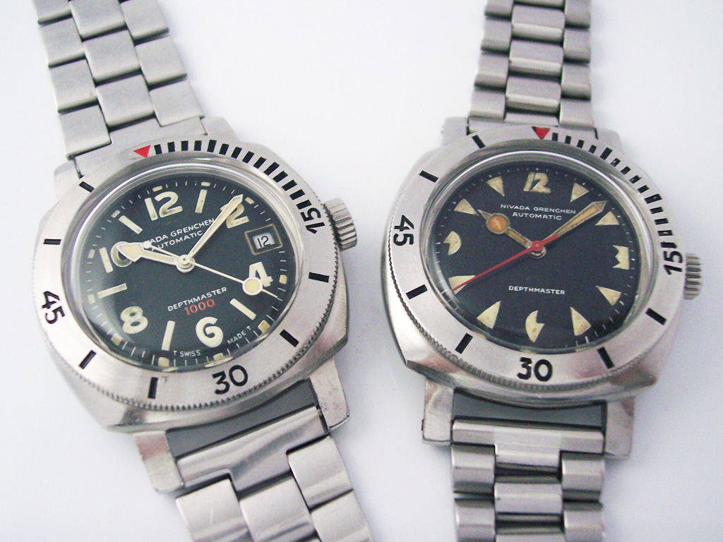 Following the successful launch of the Depthomatic in 1964 (the first watch with a built in depth gauge), Nivada Grenchen introduced the Depthmaster the following year with advertisements claiming that it was “tested deeper than any other underwater watch” and it was “Probably the world’s most waterproof watch”.
