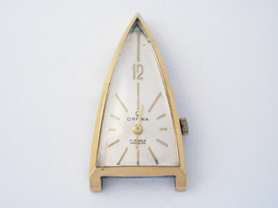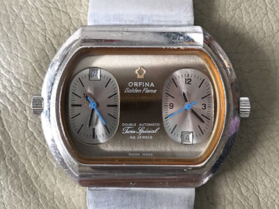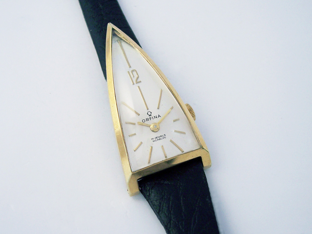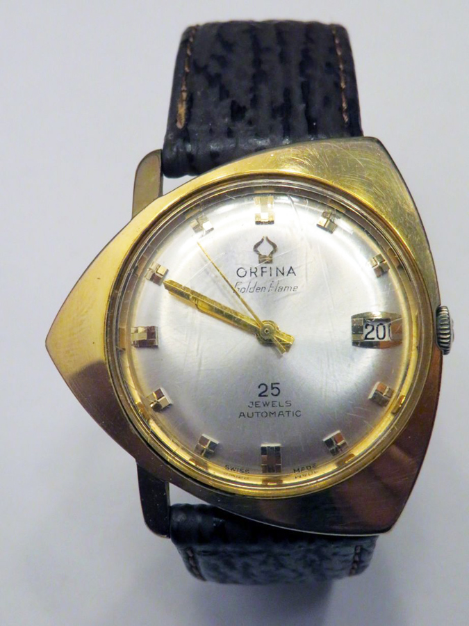 The watch in this post dates to the 1960’s when Orfina had a few unusual watches in their line-up. The Golden Flame range had several quirky models including a men’s automatic version of the watch in this post, albeit with the asymmetric case shape the other way around.