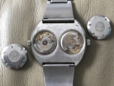 The watch had two separate automatic movements, both with date and their own crown and was available in a number of dial colours (metallic green, silver and bronze). Using two 17.2mm (7.75 ligne) ETA cal. 2671 high-beat automatic movements, the size could be kept down to a modest 44mm in diameter.