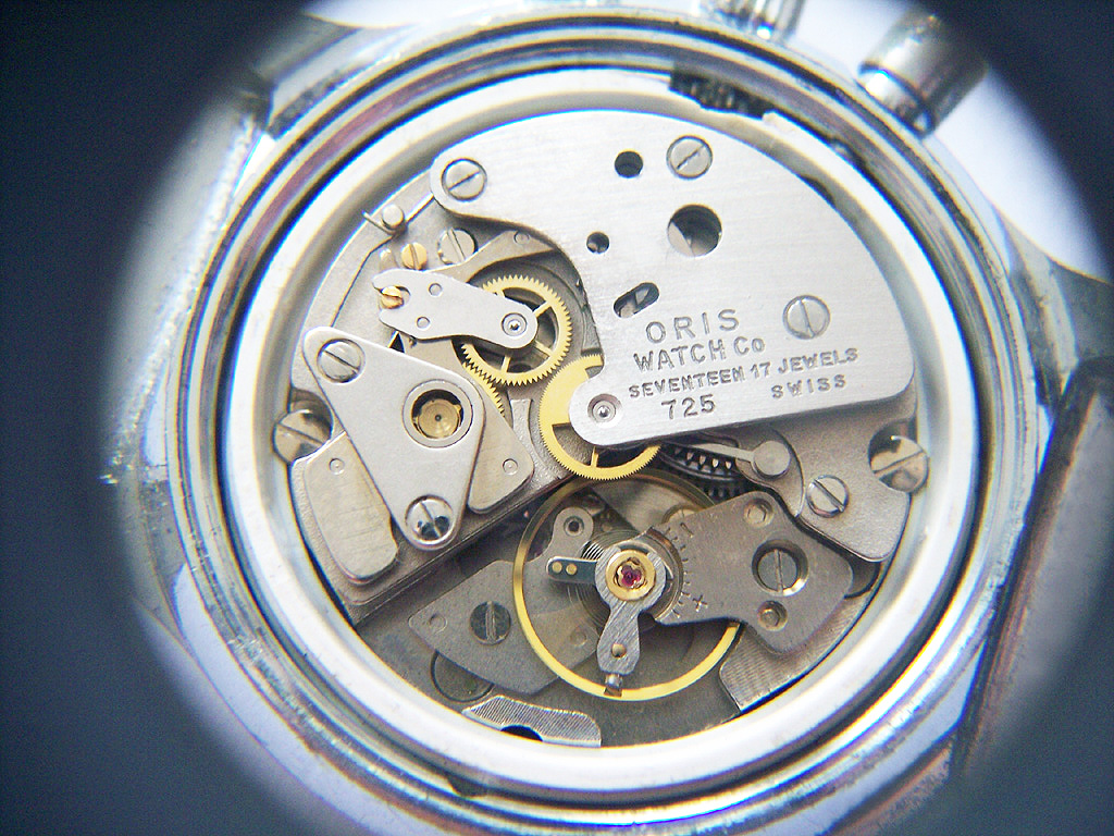 Inside this watch is the Oris cal. 725; a 17 jewel, 18,000bph, manually wound calibre with a chronograph mechanism which was designed and developed in conjunction with Dubois Dépraz, the renowned chronograph specialists.