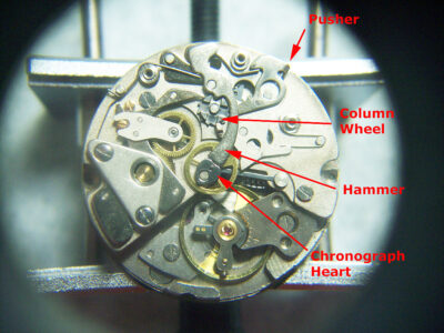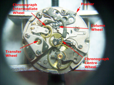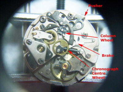 The pusher moves the column wheel around, disconnecting the intermediate wheel from the chronograph centre wheel, the brake lever falls in between the pillars of the column wheel and contacts the chronograph centre wheel, holding it in it’s current position.