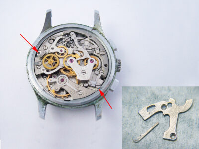 However, that wasn’t the case this time as the only parts damaged, apart from the crystal, were a screw securing one of the case clamps (the broken head and clamp had fallen into the movement stopping the watch), and the setting lever spring on the dial side.