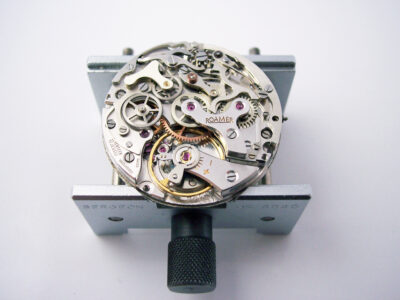 With the watch out of the case and the dial and hands removed, the calibre inside is revealed, a Valjoux cal. 72.