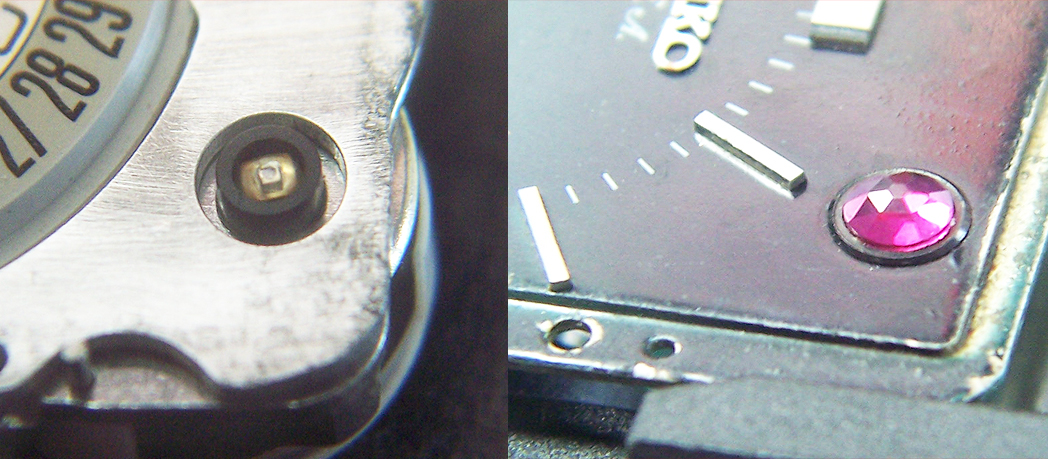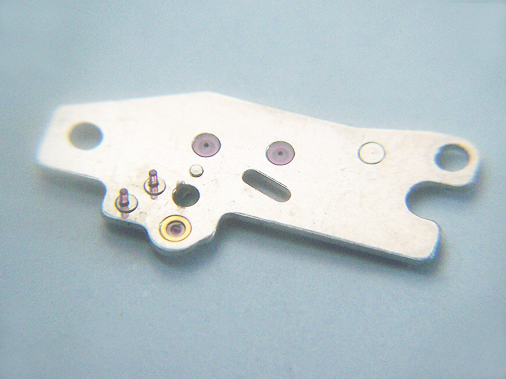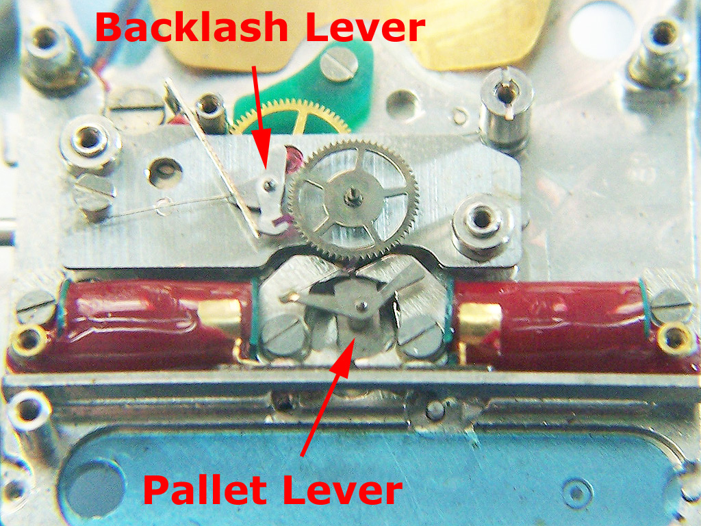 The amount of pallet lever travel can be adjusted using the two eccentric screws in the train bridge, which are fitted with jewelled banking pins on the underside. I assume these are jewelled to avoid any chance of magnetism and to reduce wear over time.